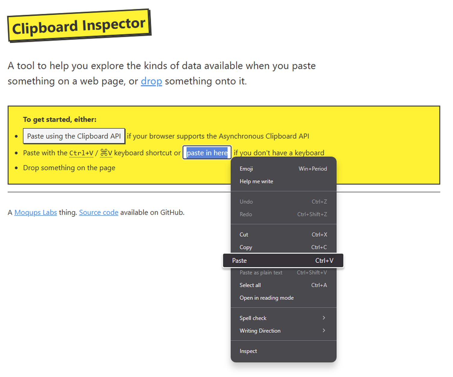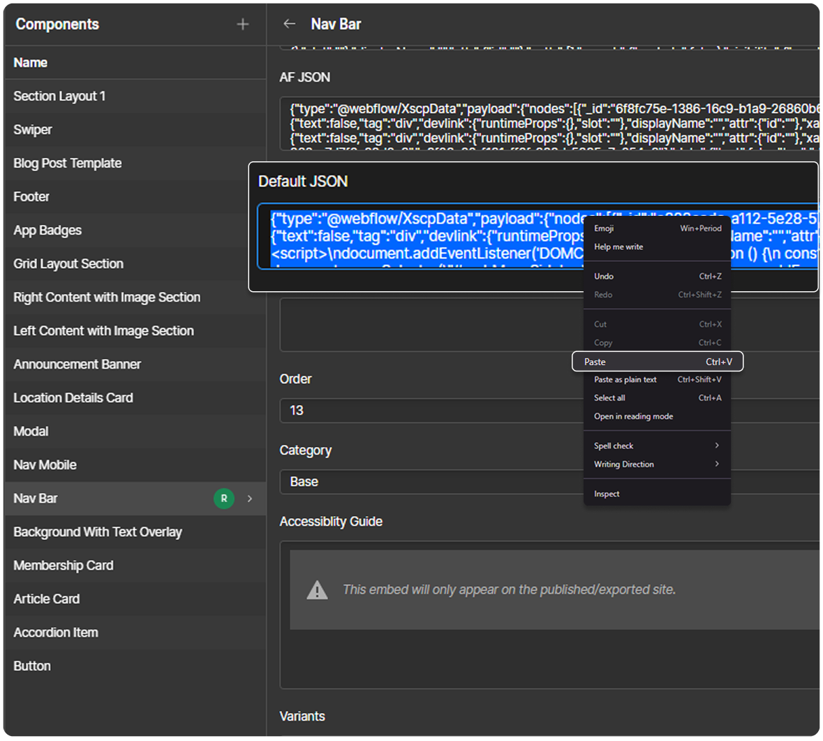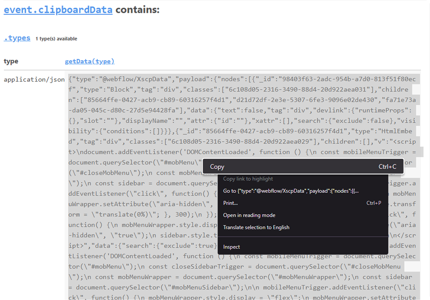 2. Open the Clipboard Inspector site and paste the copied Webflow component to generate the JSON script.