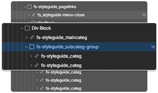 fs-styleguide_pagelinks and add a new Div Block. The Div Block contains the main category link (fs-styleguide_maincateg ) and the subcategory wrapper ( fs-styleguide_subcateg-group ) that contains a group of subcategory anchor links ( fs-styleguide_categ ).