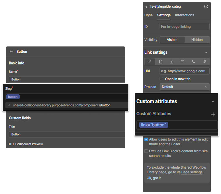 fs-styleguide_categ. In the Custom Attribute, add link=component_slug. Ensure that the attribute value matches the component slug that can be seen from the Component CMS.