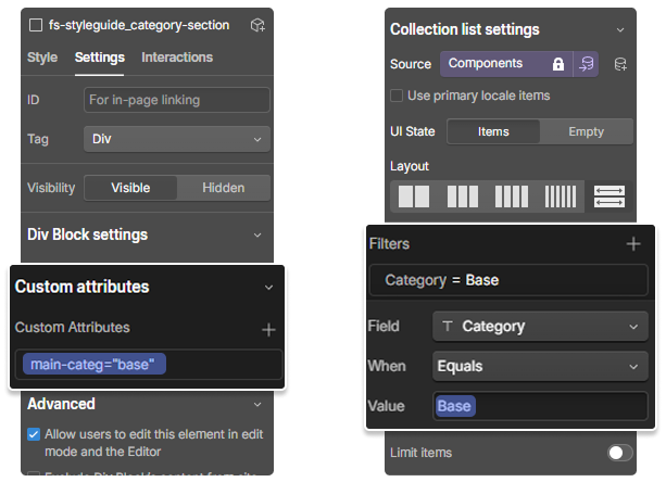 fs-styleguide_category-section. In the Custom Attributes, add main-categ=cateogory_name. The attribute value should be the same as the Category Field in the Component CMS. fs-styleguide_category-section contains Component Collection List. Go to the collection list settings and filter the category. The value should be the same as the the category setup on the section wrapper attribute.